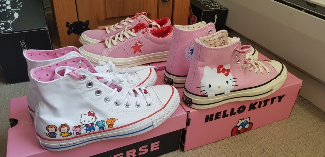 Now the latest and most hyped so far has to go to ConverseXHelloKitty. This range had a huge selection of colours and styles, even including clothes. This one, I had to be held back on a bit! 3 pairs of shoes and a t shirt later, I was one happy Kitty!