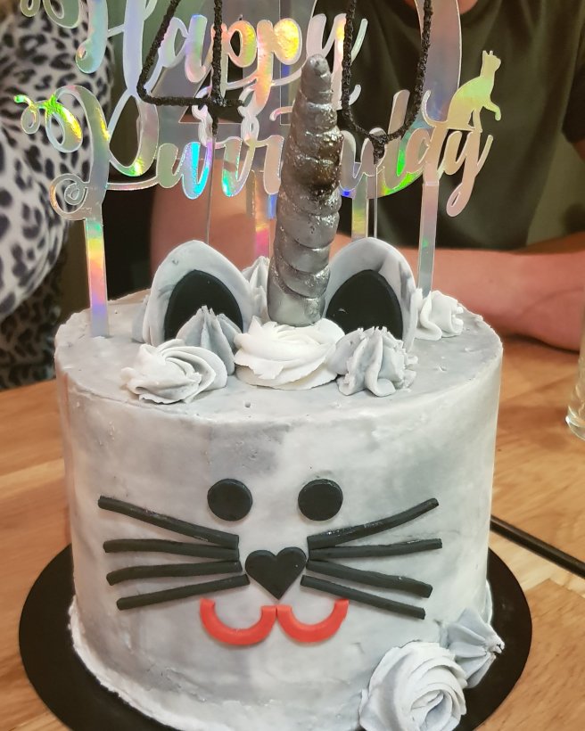 Cupcake and Co made my husband a special birthday cake of our beloved cat Lester (this was after we lit the cake, so unikitty has a bit of a burnt horn!)